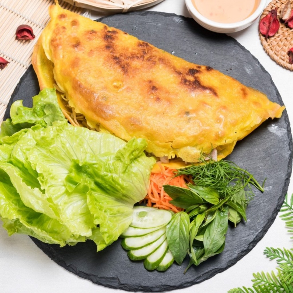 吃法介紹:用夾子將餅皮切成好入口的份量,放至生菜上,搭配豬肉、鮮蝦、豆芽菜,以及旁邊的配料後,淋上魚露包起來吃。